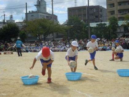 小学校で初めての運動会,とんだり,ボールを運んだりとがんばりました。