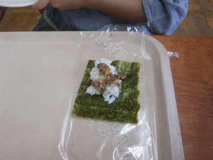 納豆は昔から食べられてきた伝統的な発酵食品ですが,独特のにおいがあるため,苦手な子どもも少なくありません。給食では,納豆が苦手な子どもでも抵抗なく食べられるように,青ネギ,しょうが,にんにくで匂いをやわらげ,子どもたちの好きなピリ辛の肉みそと合わせています。のり巻きにするとより食べやすくなるので,手巻きのりもつけました。