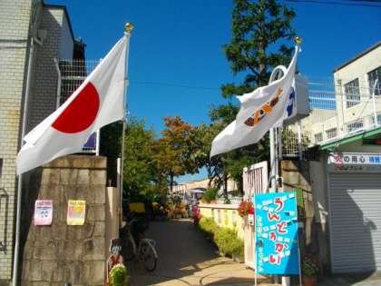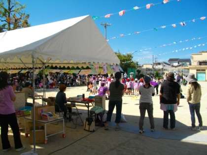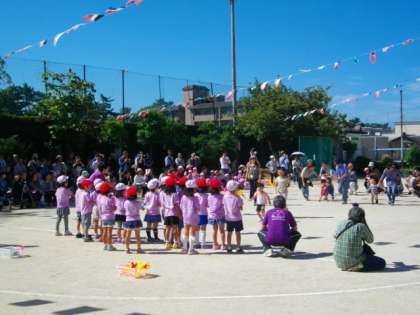 澄み渡るような秋晴れの下,元待賢小学校運動場で,待賢幼稚園運動会が開催されました。プログラムNo.8「またあえたね」では,待賢幼稚園を卒園した,本校の1〜3年生の児童が,かけっこに挑戦していました。
