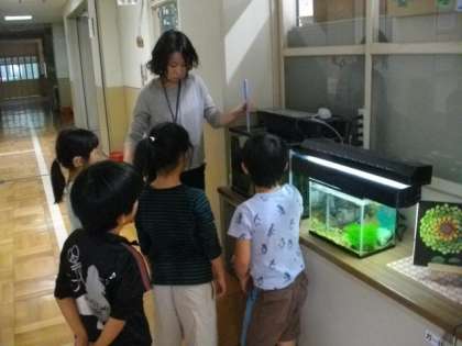 生活科では,校内にいる生き物のお世話をしようというめあてをたてて,職員室前のすいそうの掃除とえさやりをしました。