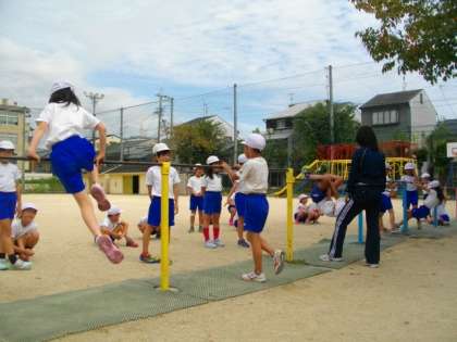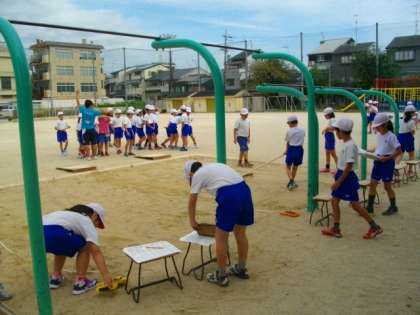 3年生が運動場で体育をしています。今日は,クラスごとに鉄棒とはばとびに挑戦していました。