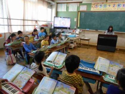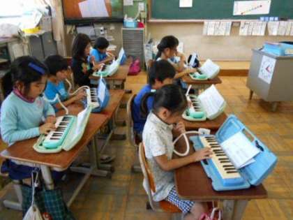 音楽で「虫の声」の曲をけんばんハーモニカで演奏する練習をしています。