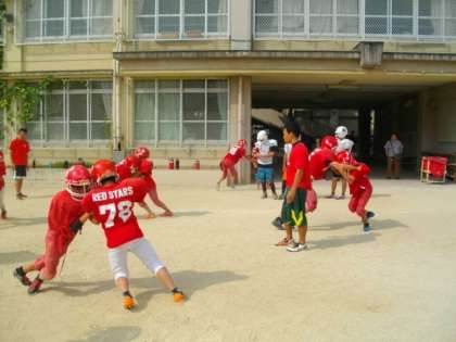 タッチフットボール部が,運動場で,12日に行われる公式戦初日に向けての調整をしています。OBの生徒が練習のサポートに参加してくれました。