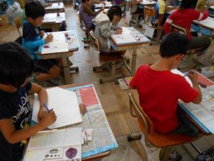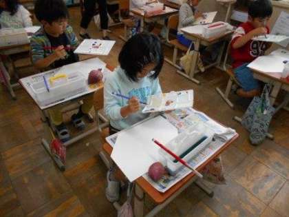 今日の午前中に収穫したサツマイモを,図工の時間に絵の具で描きました。赤・青・黄・白の4色だけで,いろいろな色をつくることができることに,みんな驚いていました。