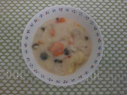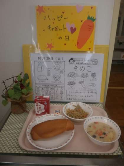 きのこのクリームシチューには,ハッピーキャロットが入っていて,子どもたちが給食室に来ると,「やったー!ハッピーキャロットの日や!」と喜んでいました。