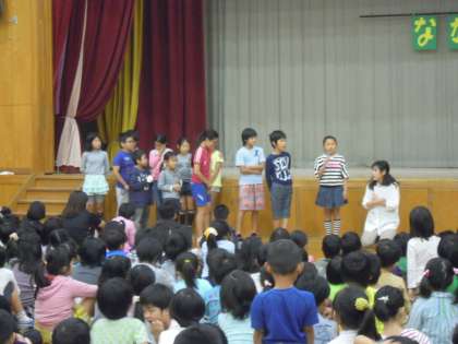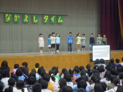 なかよしタイムで1年生の発表がありました。運動会をやり終えた感想を全校の前でお話しました。一人一人大きな声で自分の感じたことを発表していました。入学して半年,1年生もしっかり成長しています。