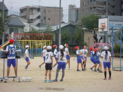 体育でバスケットボールの学習をしています。雨上がりの運動場でコンディションはあまりよくありませんでしたが,声を掛け合って一生懸命パスをつないでいました。