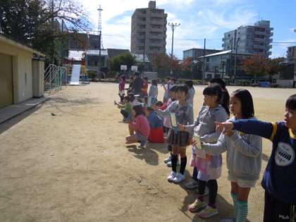 「太陽の光をしらべよう」の学習をしています。鏡をいろいろ動かして,太陽の光をうまくはねかえせるよう考えました。晴れた秋空のもと,何度も工夫しながら確かめていました。