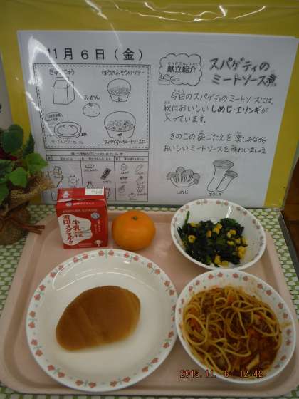 今日のスパゲティのミートソース煮には,秋においしいしめじ・エリンギが入っています。きのこの歯ごたえを楽しみながら食べていました。