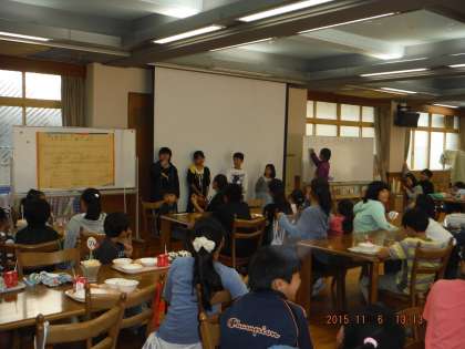 今週は,6年2組と2年3組がなかよし給食を行い,今日は最終日なので感想を発表しました。初めはなかなか会話のはずまなかった班も,今日はなかよく話しながら食べていました。