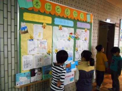 児童玄関前の掲示板に,校内読書絵はがきコンテストの作品を掲示しています。どの学年も力作ぞろいです。