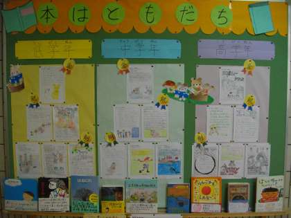 読書週間で,朝読書に取り組んでいます。児童玄関の前には,「せんせいのおすすめBOOK」のコーナーや,読書新聞のコーナーがあります。