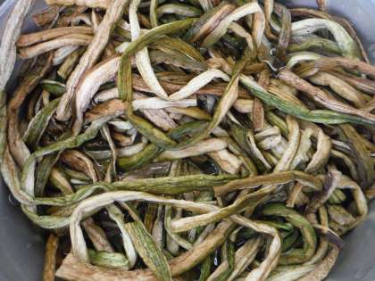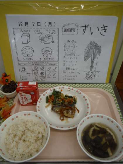 ずいきは,里芋の茎の部分です。今日の給食には,干したずいきを水でもどして使っています。食物せんいが,多く含まれていて,おなかのそうじをしてくれます。