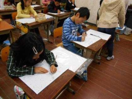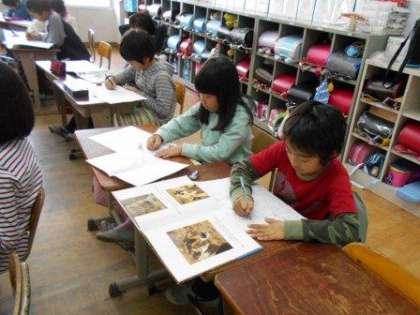 図画工作の学習で,スチレン版画に取り組んでいます。下絵をかいたり,版に下絵を写したりと,自分の表したいものに合わせて版画の制作をすすめています。