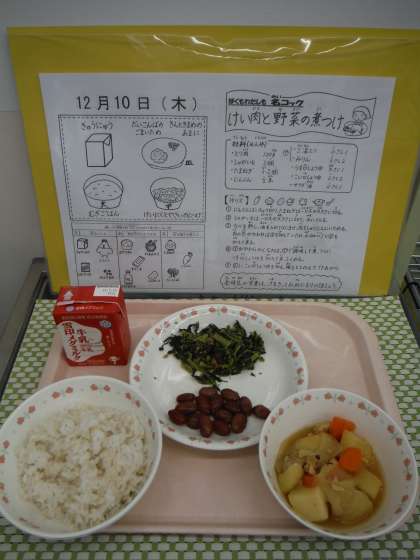 「けい肉と野菜のにつけがおいしかったです。なぜかというと、肉や野菜がやわらかかったからです。また,玉ねぎもあまくておいしかったです。また作って下さい。」(5年児童)