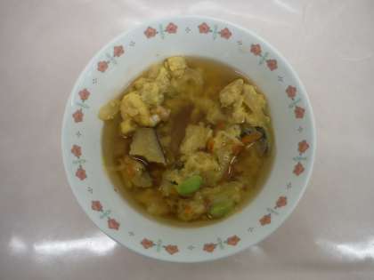かにたまのあんかけは,カニのほぐし身と,たまねぎ・にんじん・枝豆・しいたけを