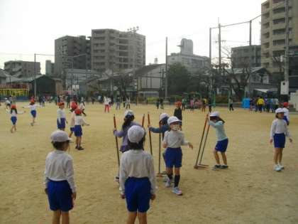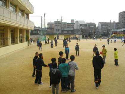 中間休みです。子どもたちの元気な声が響いています。1年生は,縄跳びをしています。