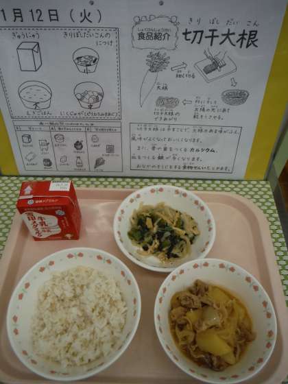 切干大根は、干すことで大根の甘みが増え,風味が良くなっておいしくなります。また、骨や歯をつくるカルシウム,血を作る鉄が多くなります。おなかのそうじをする食物繊維もとれます。