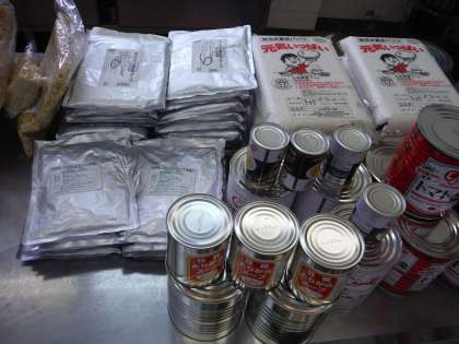 今日の給食は,給食室で保管しておいた米や缶詰,乾燥野菜を使って作りました。