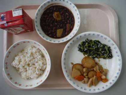 日本では,昔から,お正月にそなえたかがみもちで「ぜんざい」を作る習慣があります。甘く煮たあずきとおもちが入った「ぜんざい」を食べてい一年間の健康を願います。給食では,おもちのかわりにさつまいもが入っています。