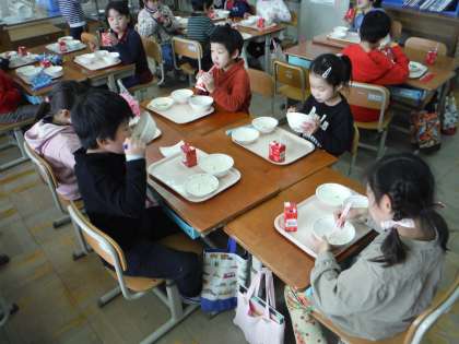 初めて酢味噌を食べたという一年生もいましたが,始めは減らしに来た児童もおかわりし,「おいしい」と喜んで食べていました。