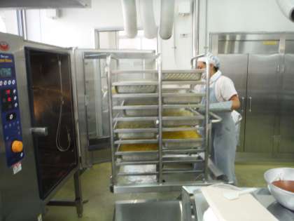 ボルシチのじゃがいもとほうれんそうのソテーのコーンをスチームコンベクションオーブンで蒸してから調理しました。野菜の甘みがでて美味しいと好評でした。また,ボルシチの人参がハッピーキャロットで子どもたちは今日の喜んで食べていました。