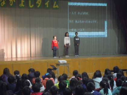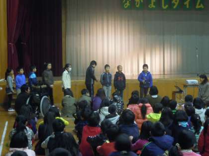 2月の「なかよしタイム」を行いました。今月は草の芽学級児童の発表でした。しっかりと自分の体験や感じたこと,考えたことを発表することができました。全校のみんなも静かに聞き,感想を発表しました。