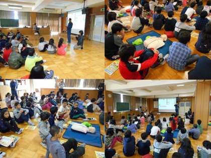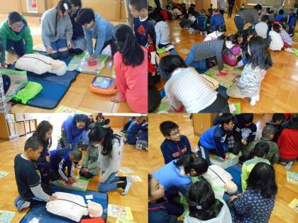 子どもたちはしっかり話を聞き,心肺蘇生法を練習していました。