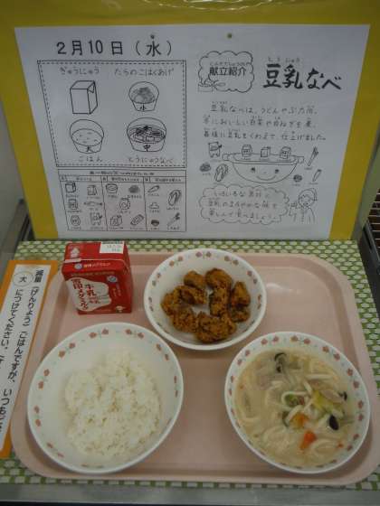 「いつもおいしい給食ありがとうございます。豆乳なべがおいしかったです。うどんに甘いねぎの味と豆乳のまろやかさがありほっぺたがおちそうでした。たらのこはくあげは,外はカリカリ,中はふわりとしていておいしかったです。」(3年児童)