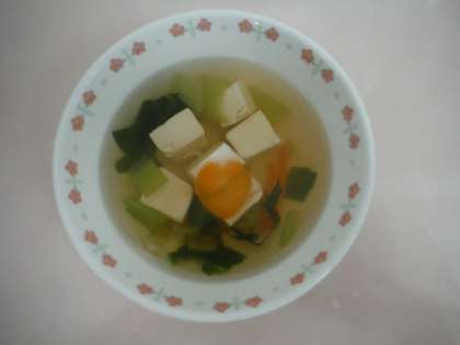 豆腐と青菜のスープには,ハート型の人参が入っていて子どもたちは見つけて大切そうに