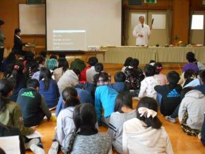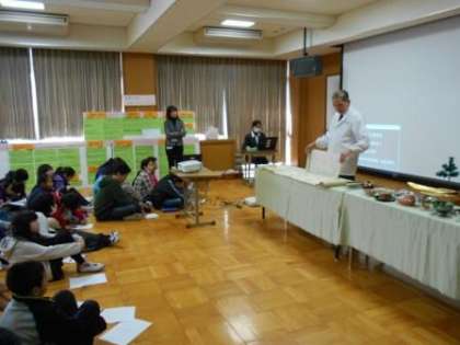 料亭の調理人さんをお招きし,和食についての話を聞きました。料理の時に使う包丁や器,昔の料理などについて,実際の器や巻物資料などを見せていただきながら,いろいろな話を聞くことができる貴重な機会となりました。一生懸命メモを取りながら話を聞いていました。