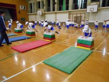 いろいろなとび方に挑戦しています。友達と協力して準備をしています。