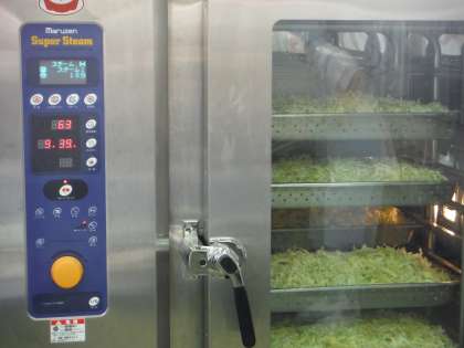 ホットドックの具のソテーのコーンとキャベツの半分以上をスチームコンベクションオーブンを使用して,蒸してから炒めました。蒸すことで,野菜の甘みやうまみが増し美味しくできました。