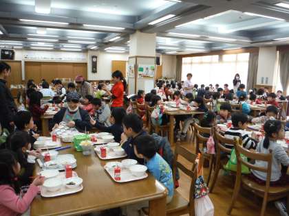 本校の1年生98名と先生6名,総勢126名(欠席数が分からないため人数に入っています。)が一緒に給食を食べました。
