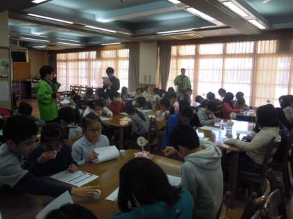 京都市茶業青年会の皆様にお世話になり,茶香服体験の学習を行いました。4種類のお茶の,見た目,香り,実際にお茶を入れた味を味わって,何というお茶かをあてるという体験です。子どもたちは真剣に香りをかいだり,入れていただいたお茶を味わったりして,取り組んでいました。お茶の種類によってずいぶん違いがあることに,驚いている様子でした。