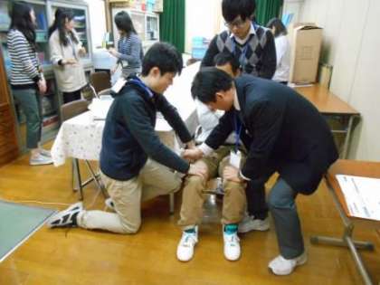 明日の給食開始を前に,教職員で給食研修を行いました。給食の指導や食物アレルギー対応を全員で確認したり,エピペン®の使い方の実習をしたりしました。