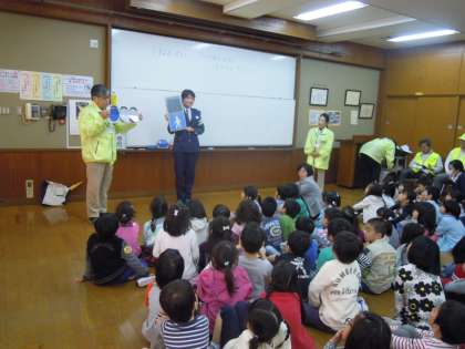お話を聞いた後,実際に学校の近くの道を友達と2人組で歩いてみました。地域の方が見守っていただく中,しっかり歩くことができました。毎日の登下校や外に出かけた時は,今日教えてもらったことを忘れず,安全にすごしてほしいと思います。