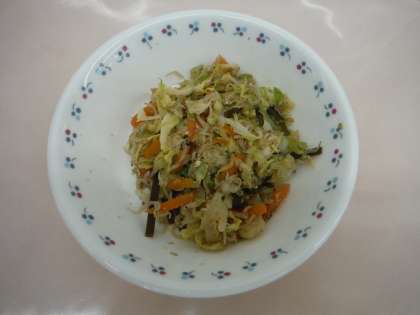 京都産の新キャベツをたっぷり使ったごま酢煮には,細切り昆布やしらす干しが入っていました。