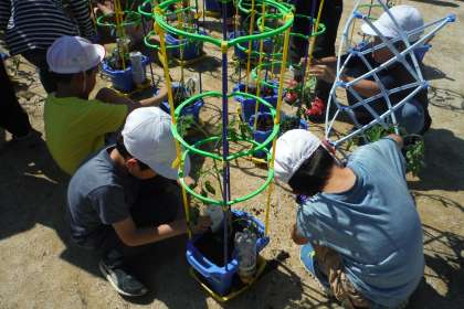 2年生が5校時にトマトの苗植えを行いました。