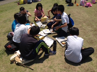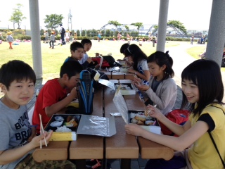 グループで昼食をとっています。今日の昼食は,みそカツ弁当です。名古屋の名物をいただいています。