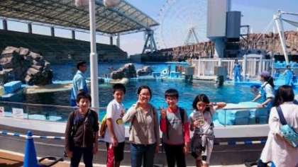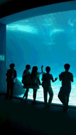 イルカショーの後は,グループで水族館を見学しています。