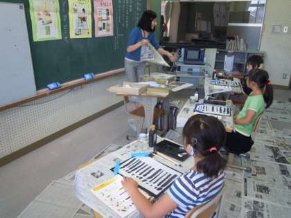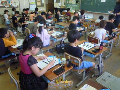 初めて毛筆を使った書写の学習をしました。道具の名前や使い方,置き方などを学習した後,筆に墨をつけていろいろな線を書いてみました。筆をまっすぐ持って,力を入れたり,力をぬいたり。墨のいい香りがする中,がんばって取り組みました。