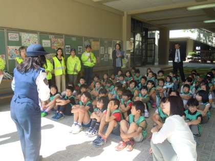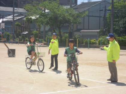 晴天の元,一日延期になっていた自転車教室を実施しました。地域の皆さんや上京警察署の皆さんにお世話になり,自転車の安全な乗り方について学習しました。お話を聞い