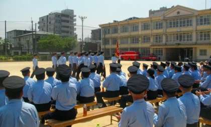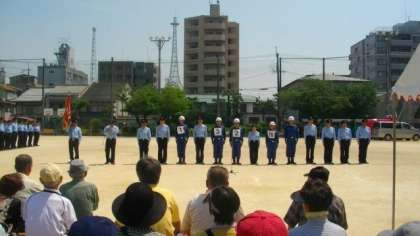 5月22日(日)午前7時から9時30分まで富小路グランドで,上京消防団総合査閲が実施されました。本年度は,本校校区にある地域の消防分団が参加をされました。29日に消防活動総合センターで行われる査閲に向けて,今日は,本校の運動場で日頃の練習成果を披露され,たくさんの方々が激励にこられました。