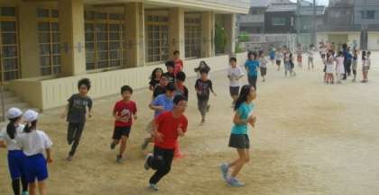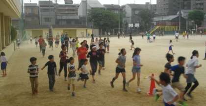 6先生は集団登校のあと,自分のめあてにそって「朝マラソン」に挑戦しています。時間内に何周走れるかに挑戦しているお友達もいれば,毎日自分のペースで「走り続ける」ことを目標にしているお友達もいます。