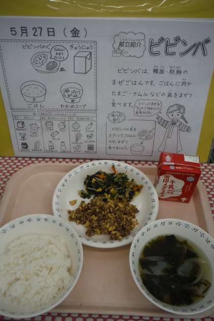 「わたしは,ビビンバの具がおいしかったです。ビビンバには,赤色や緑色,黄色の三色が入っていたのですごいなあと思います。」(3年児童)