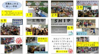 1年生は,「みんななかよし やるきいっぱい・やさしさいっぱい・げんきいっぱい」でしたね。毎朝,とても大きな声であいさつをしてくれるお友達がたくさんいます。給食も,残さず食べきっていますね。お勉強も「やるきいっぱい」でがんばっています。すばらしいですね。