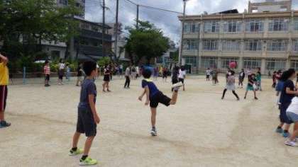 昼休みの空は黒い雲が見えていたのですが,雨が降ることはなく,涼しい中で遊ぶことができました。中学年・高学年の子どもたちは,スポーツ保健委員会が企画しているドッヂボール大会に向けて練習している学級が今日も多かったです。