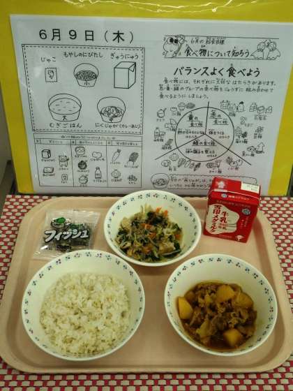 6月の給食目標は「食べ物について知ろう」です。食べ物には,それぞれに大切なはたらきがあります。赤・黄・緑のグループの食べ物をじょうずに組み合わせて食べるようにするといいですね。