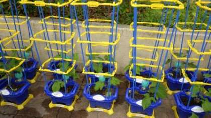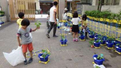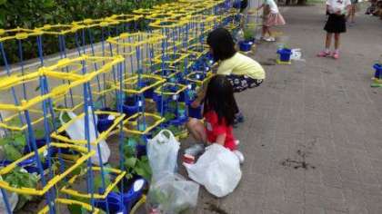 一人一鉢で育てているアサガオの間引きをしました。間引いたものは家に持ち帰るか,学校で育てたいと思います。支柱もとりつけました。